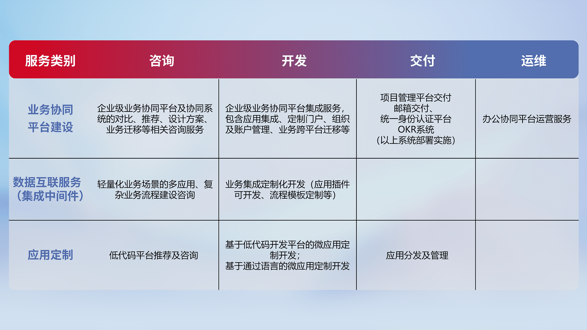 针对钉钉、、企微、、、IDaas等平台级产品提供产品的规划、、、、方案、、、、交付、、、、定制化开发等服务,,,,实现如统一协同办公、、、智能客户服务、、混合会议管理、、、、智能数据查询、、、等业务场景,,实现数字化转型。。