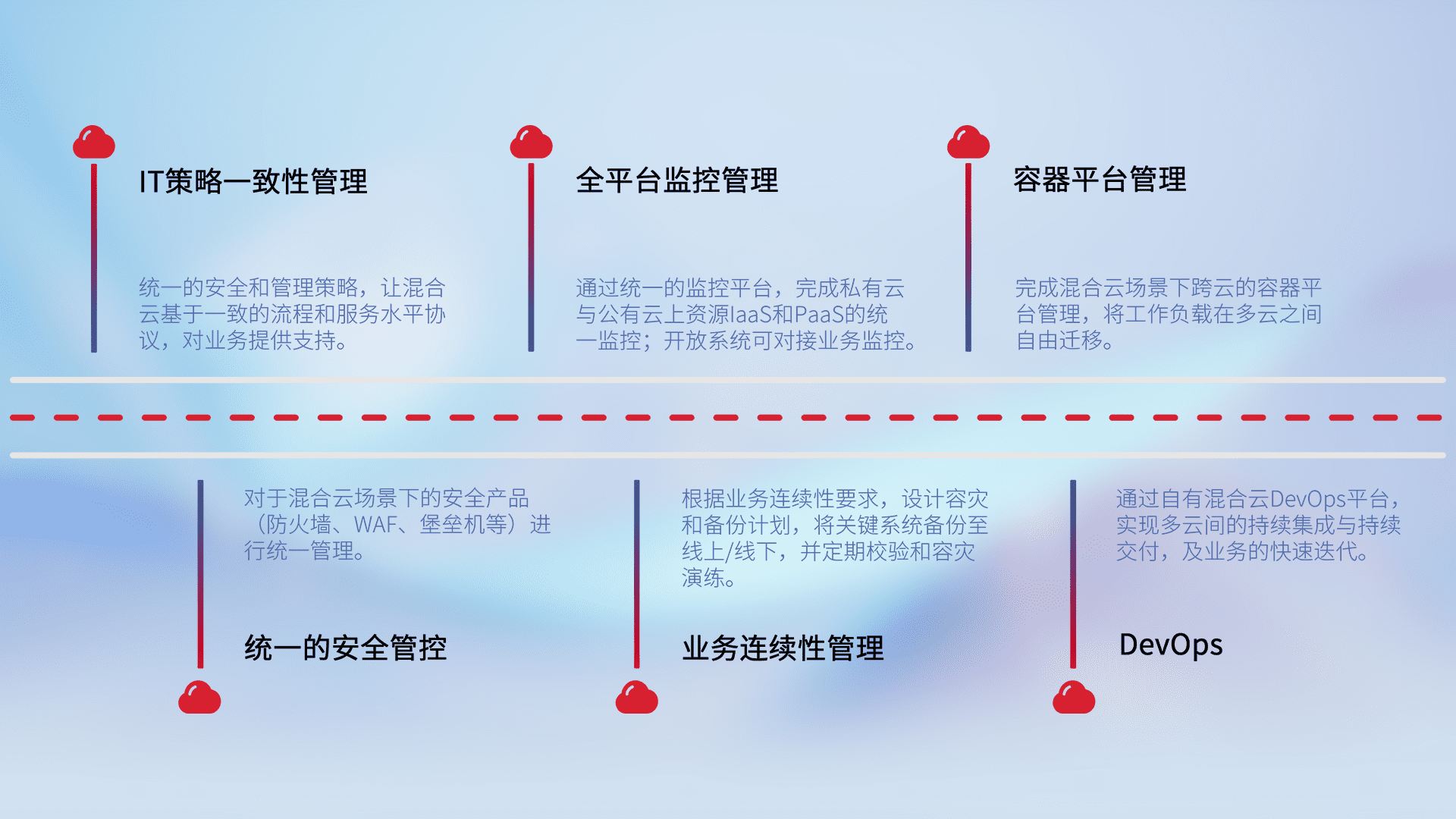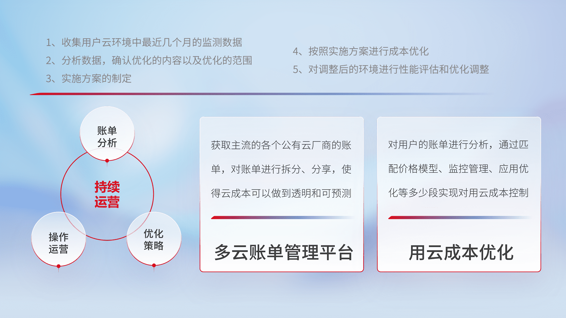 通过多云纳管,,以统一的资源数据模型把客户的云资源进行抽象和封装,,进而实现对多云资源的统一操作,,,保障云资源管理的可靠性、、、、稳定性与可用性。。。量身定制化运维内容,,,配置、、开发运维、、、、补丁管理、、、备份、、、监控、、、、认证和访问管理、、、、审计和日常巡检等,,,保障在用云过程中的可靠度,,,稳定度以及高可用率。。